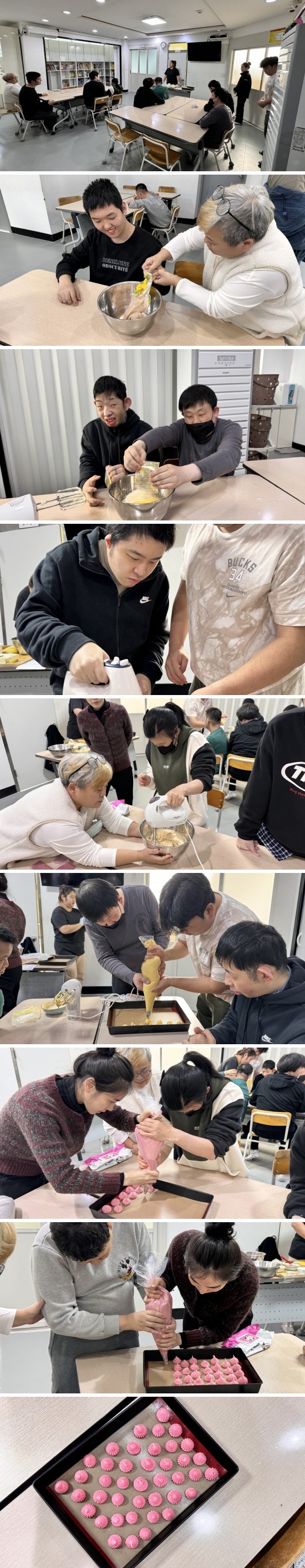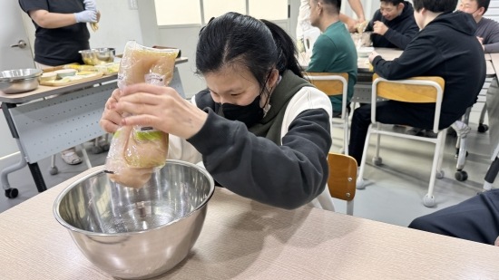 완성된 반죽을 짤 주머니에 넣고 다시 한번 선생님들의 도움을 받아 시계방향으로 반죽을 짜며